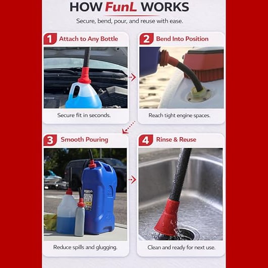 Stop wasting time cleaning up spilled fluids and struggling with hard-to-reach engine bays. The FunL Stretchable Automotive Funnel 3-Pack makes every car maintenance task faster, cleaner, and easier. Grab your set now and make fluid transfers stress-free! 🛒🚗